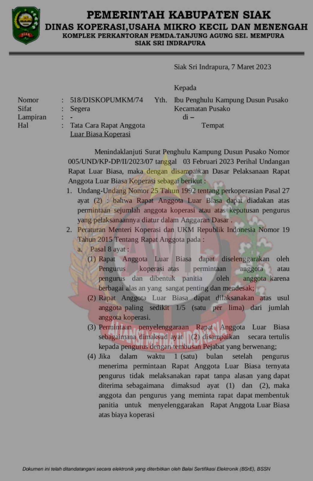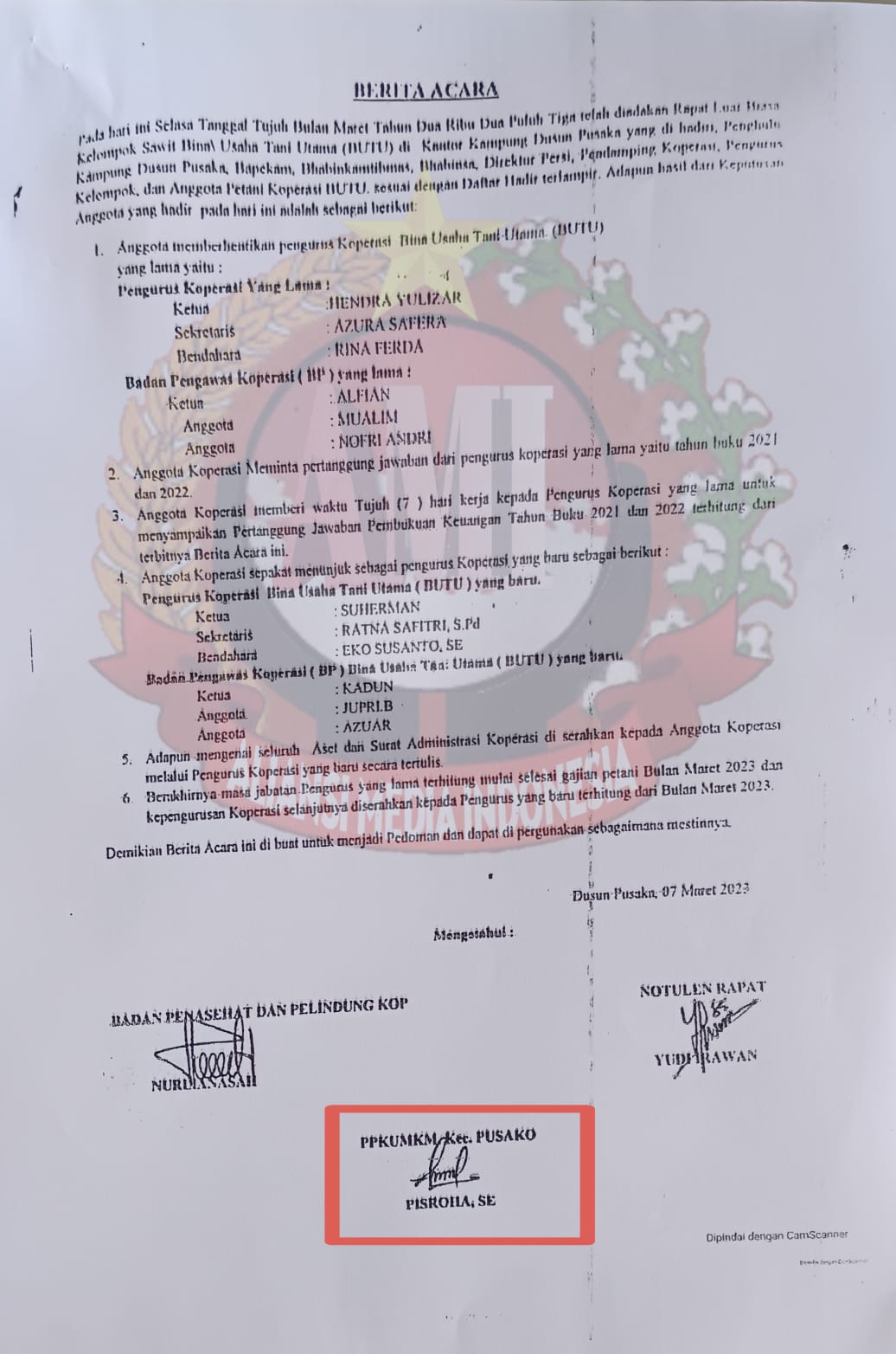Dimana Pisroha, SE selaku Sarjana Pendamping (PPKUMKM) Kecamatan Pusako mewakili Dinas Koperasi Usaha Mikro Kecil dan Menengah diduga telah mengobok-obok Koperasi BUTU, dengan dugaan melegalkan tindakan yang dilakukan Nurlianasah selaku Penghulu Kampung Dusun Pusaka dengan turut hadir dalam Pelaksanaan Rapat Luar Biasa Koperasi yang dilaksanakan oleh Kepala Penghulu tertanggal 07 Maret 2023 lalu bertempat di Kantor Penghulu Kampung Dusun Pusaka Kecamatan Pusako, berdasarkan surat Undangan yang dibuat menggunakan KOP Surat Penghulu Dusun Pusaka bernomor : 005/UND/KP-DP/III/2023.