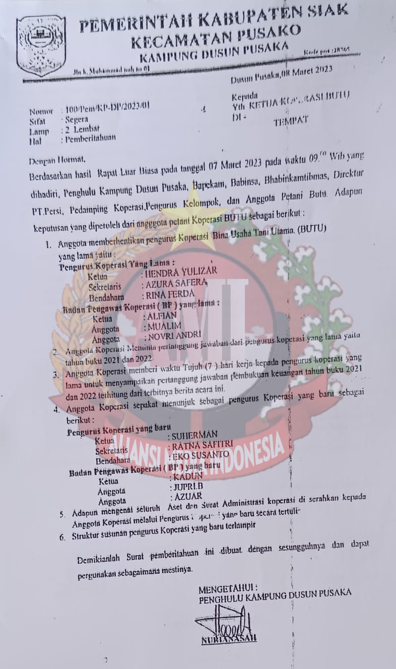 SIAK – Koperasi Bina Usaha Tani Utama (BUTU) Desa Dusun Pusaka Kecamatan Pusako, layangkan surat yang ditujukan kepada Kepala Dinas Koperasi, Usaha Mikro Kecil dan Menengah Kabupaten Siak dengan Nomor : 007/KOP.BUTU/III/2023 dengan Perihal Permintaan Tindakkan Tegas dan Sanksi Kepada Pisroha,,SE selaku Sarjana Pendamping (PPKUMKM) Kecamatan Pusako tertanggal 13 Maret 2023.