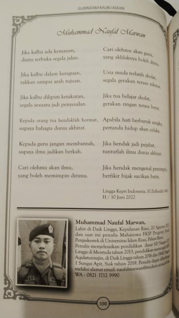 Dalam Buku Gurindam Kalbu tersebut, Naufal Marwan juga melampirkan foto dirinya di bagian bawah karya tulis. Tampak dalam foto tersebut ia memakai baju seragam Pakaian Dinas Lapangan (PDL) Menwa lengkap dengan Baret ungu.