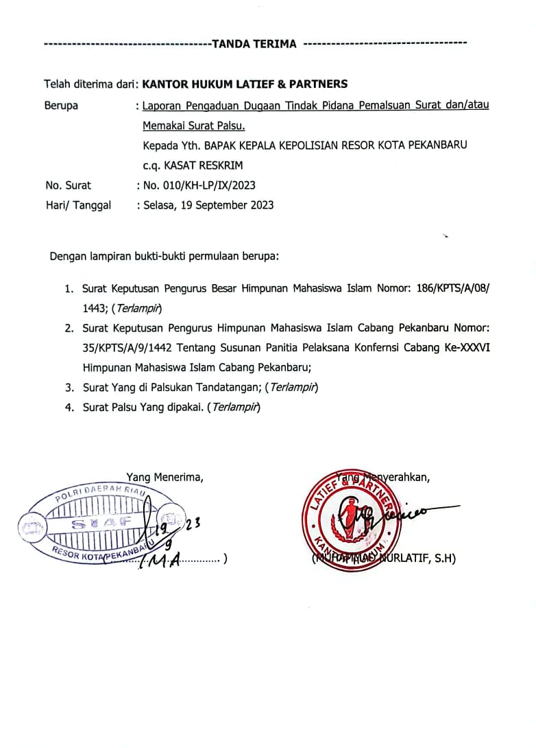 Oleh sebab itu pada Selasa, (19/09/2023) pihak yang di rugikan yaitu Pajarihin Ritonga, Zul Fajri dan Amir Machmud Simatupang masing-masing sebagai pengurus HMI Cabang Pekanbaru Periode 2022-2023, mereka membuat dan mengajukan laporan pengaduan di Satreskrim Polresta Pekanbaru yang didampingi Kantor Hukum Latief & Partners.