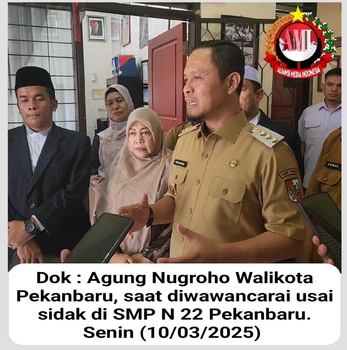 “Yang kita lakukan hari ini adalah sidak tanpa ada memberitahu siapa-siapa selain Kepala Dinas, untuk mengecek terkait infrastruktur, sarana prasarana disekolah yang didapati pada hari ini memiliki WC yang sangat minim, ruang belajar, dan memastikan program Pekanbaru Cinta Al Qur’an berjalan atau tidak dan/atau hanya sekedar program yang di iyakan saja di hadapan Walikota namun tidak jalan di kota, ” beber Agung Nugroho Walikota Pekanbaru, saat usai melaksanakan sidak di SMP Negeri 22 Pekanbaru, Senin (10/3/2025).